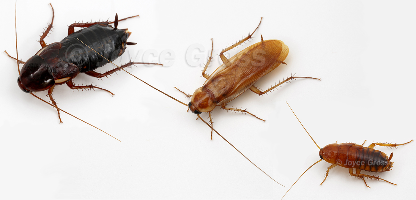 Turkestan roaches (Shelfordella lateralis, aka Blatta lateralis). Adult female on left; adult male in middle; nymph on right.